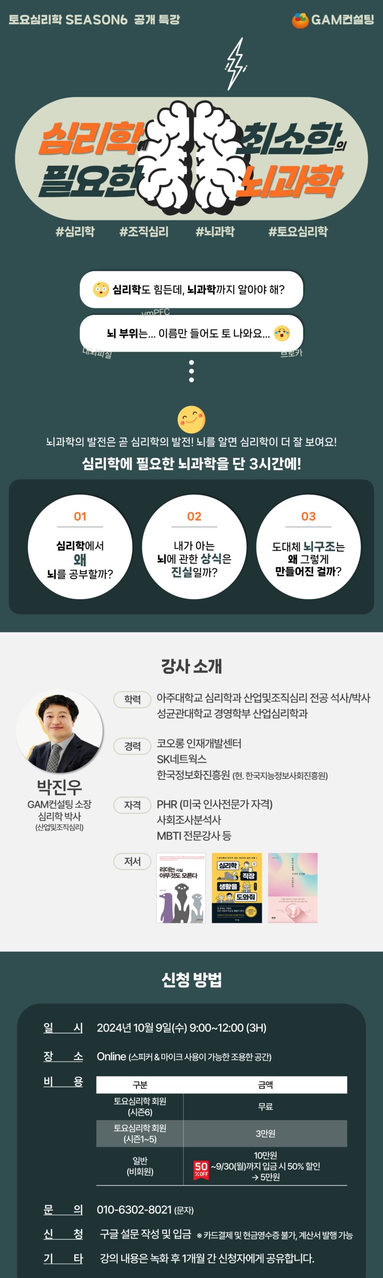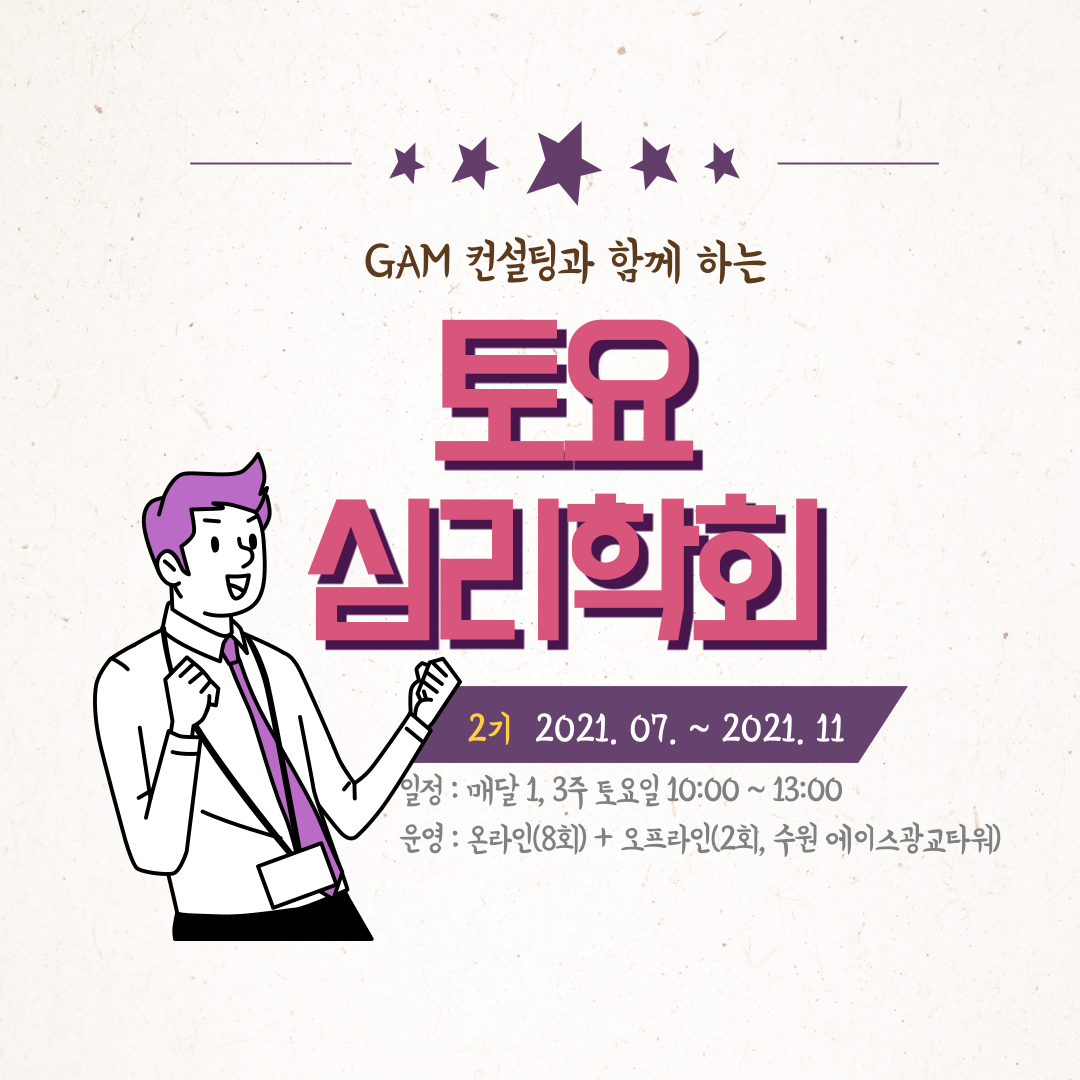 강사,교육담당자, 작가,기획자 및 콘텐츠 창작을 하고 싶은 일반 직장인들을 위한 국내 최고의 심리학 학습모임 “토요심리학”이 그 일곱번째 시즌 “설득” 이라는 주제로 여러분을 찾아갑니다. Q1. 토요심리학이 뭔가요?    국내 최고의 심리학 학습전문 기관인 GAM컨설팅에서 2020년 첫번째 시즌을 시작한 이래, 여섯번의 시즌 동안 무려 130여명의 졸업생과 50권의 심리학 전문서적을 분석하여 학습한 국내 유일의 사설 심리학 학습 프로그램 입니다.  … 더 읽기